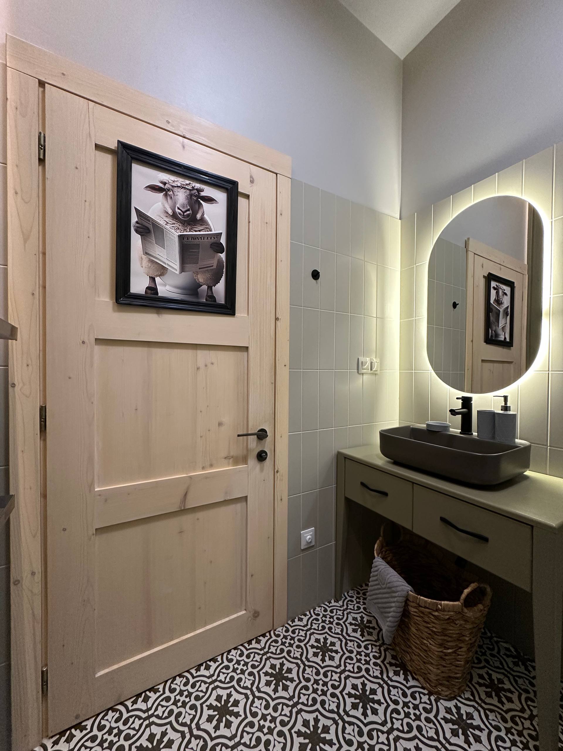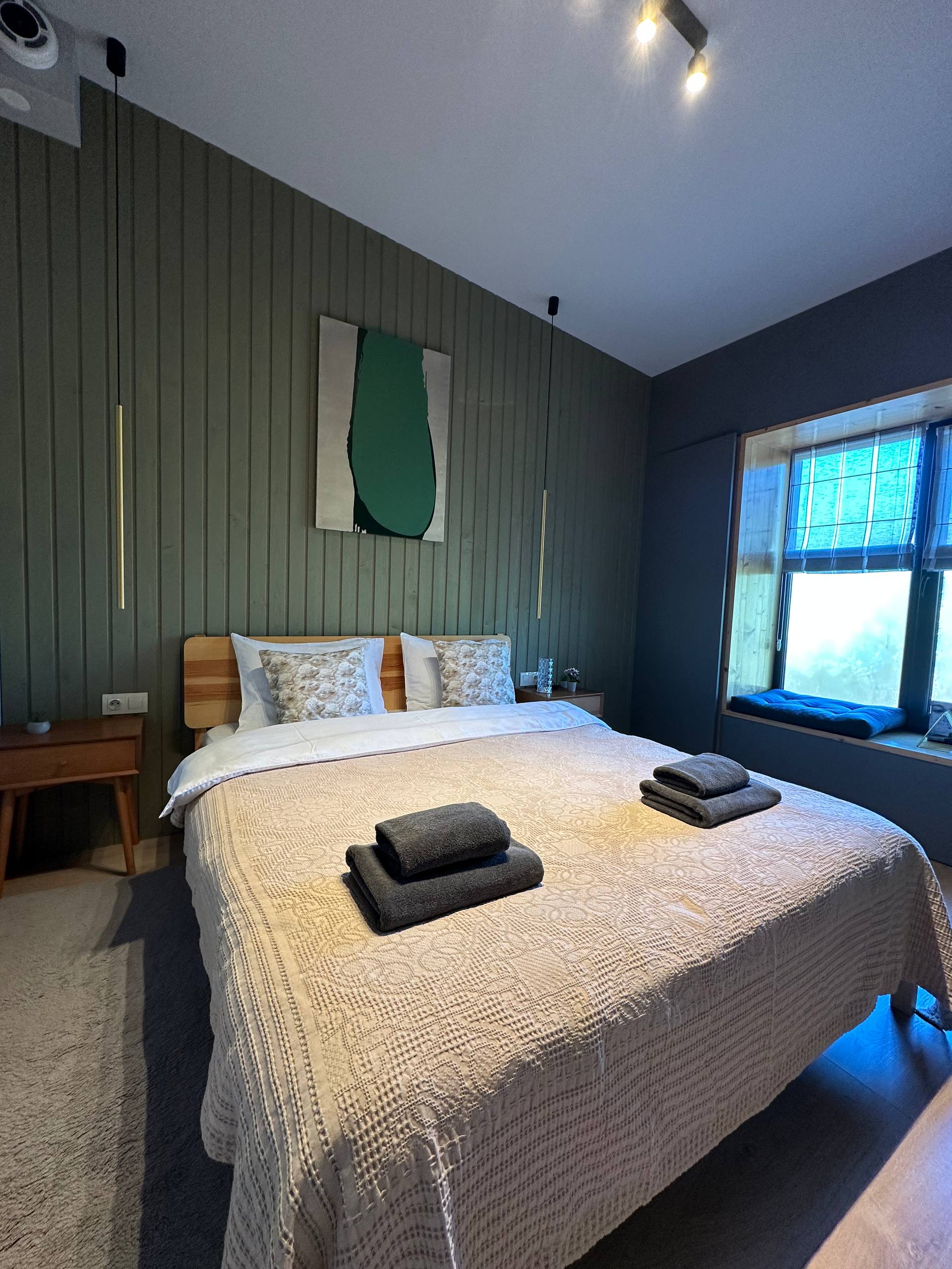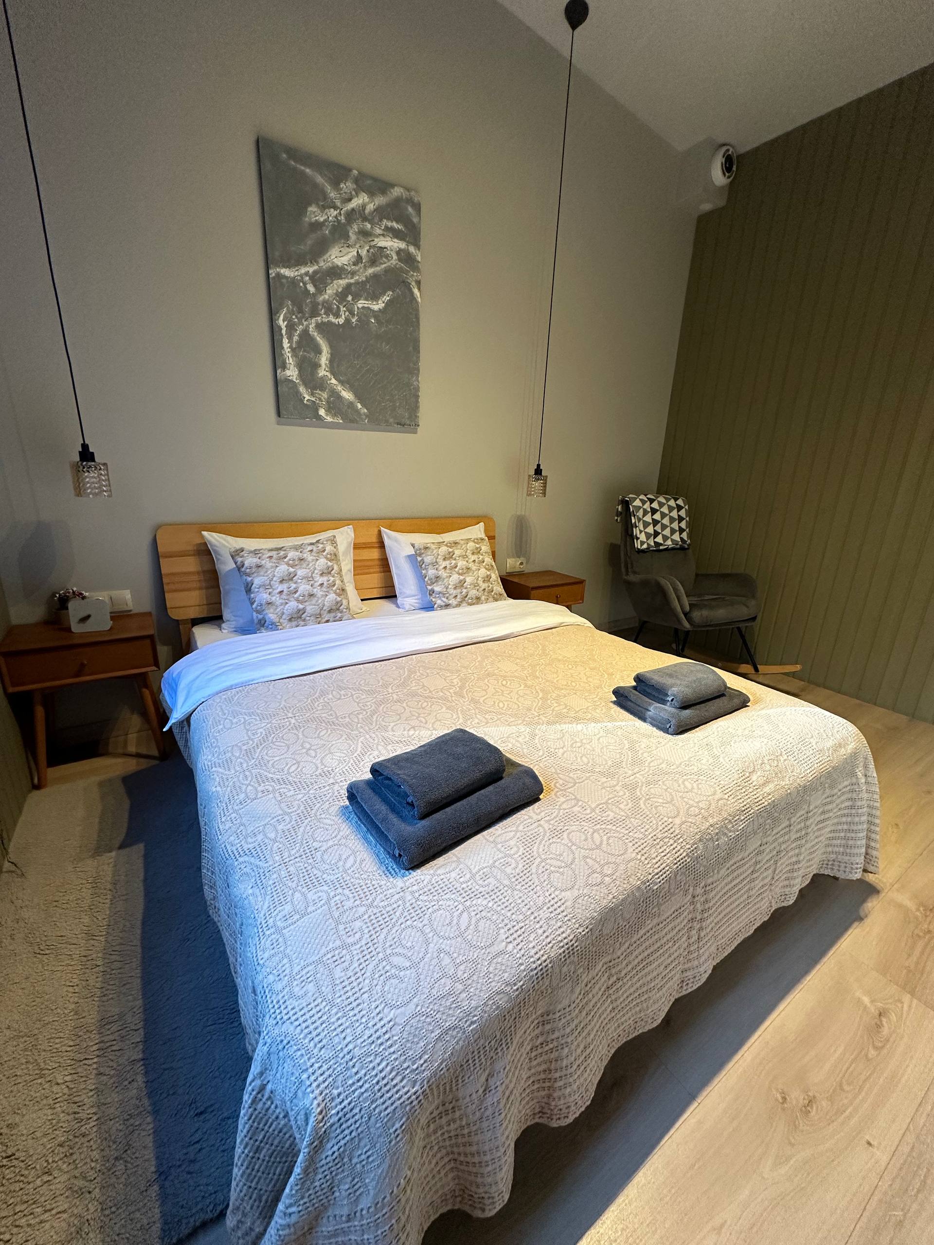 Затишна спальня з великим дерев’яним ліжком, м’яким освітленням та комфортним ортопедичним матрацом. Тут ви зможете відпочити, відновити свої сили, почитати, вмостившись зручненько в крісло-гойдалку, або поспостерігати за неспішним життям через велике вікно в будиночку у Карпатах влісі, або просто переглядати фільми чи серіали закутавшись в тепле покривало.