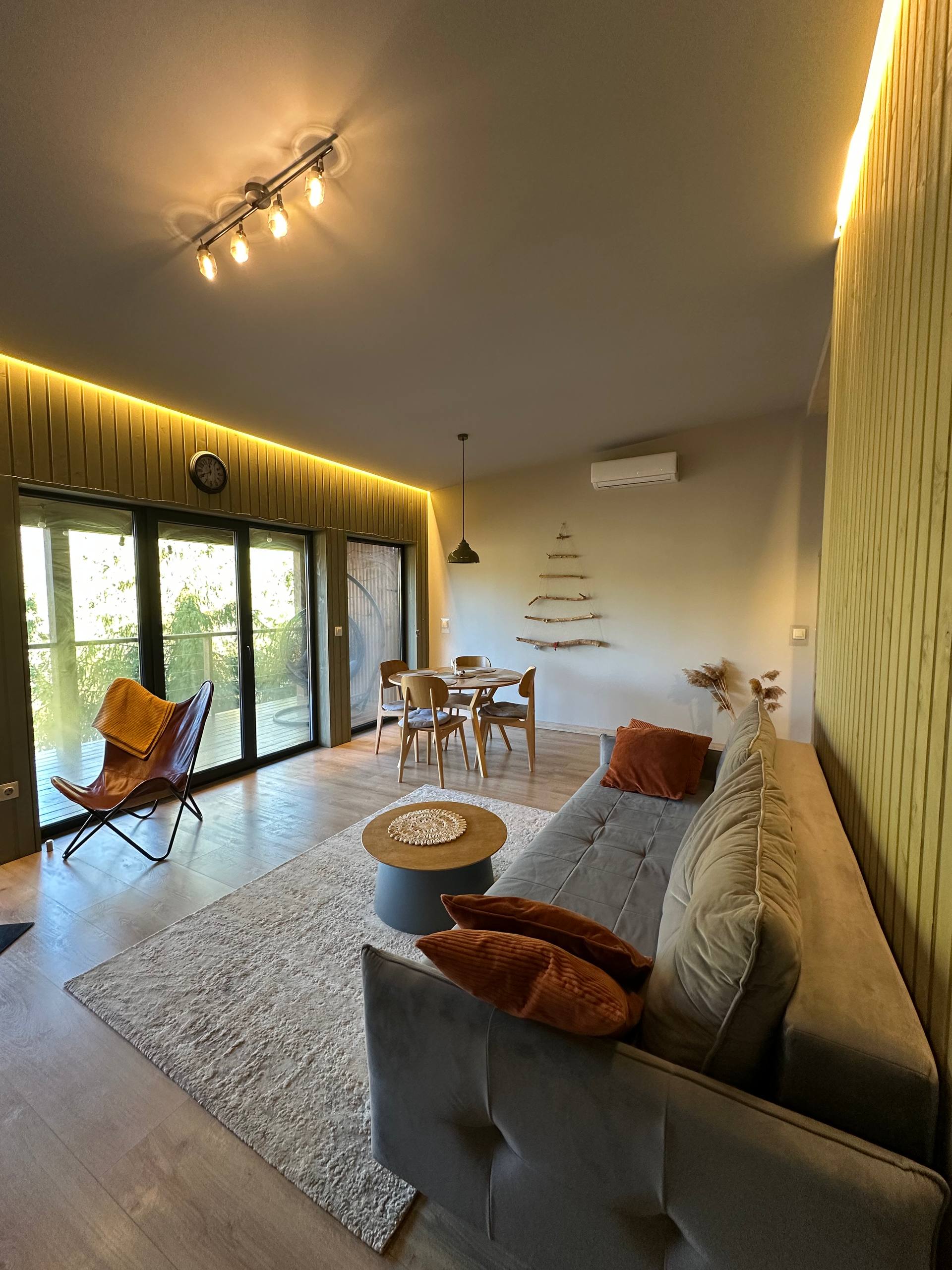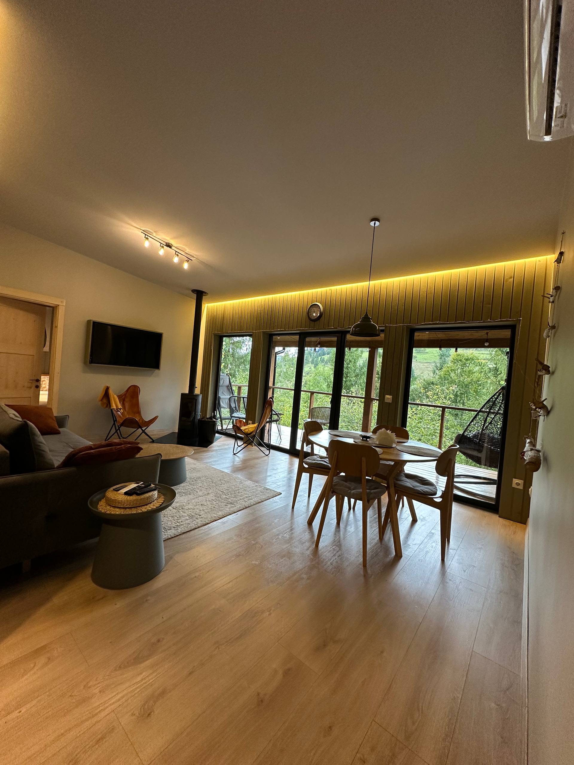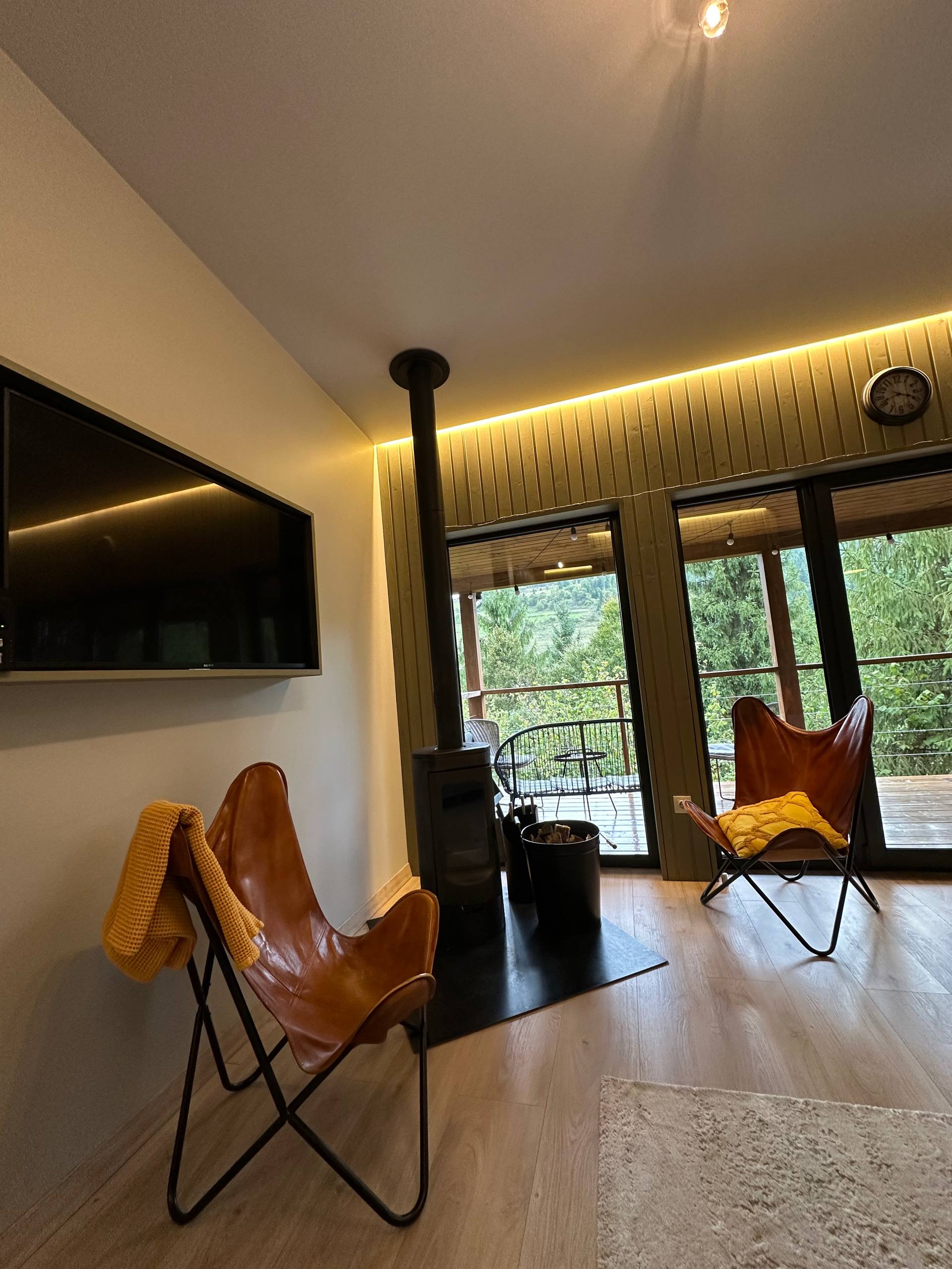 Вітальня зустріне вас величезними панорамними вікнами, з яких відкривається неперевершений вид на гори та ліс. Тут ви зможете відпочити на м’якенькому диванчику, спостерігаючи за гірською природою та слухаючи потріскування дрів в сучасному каміні.