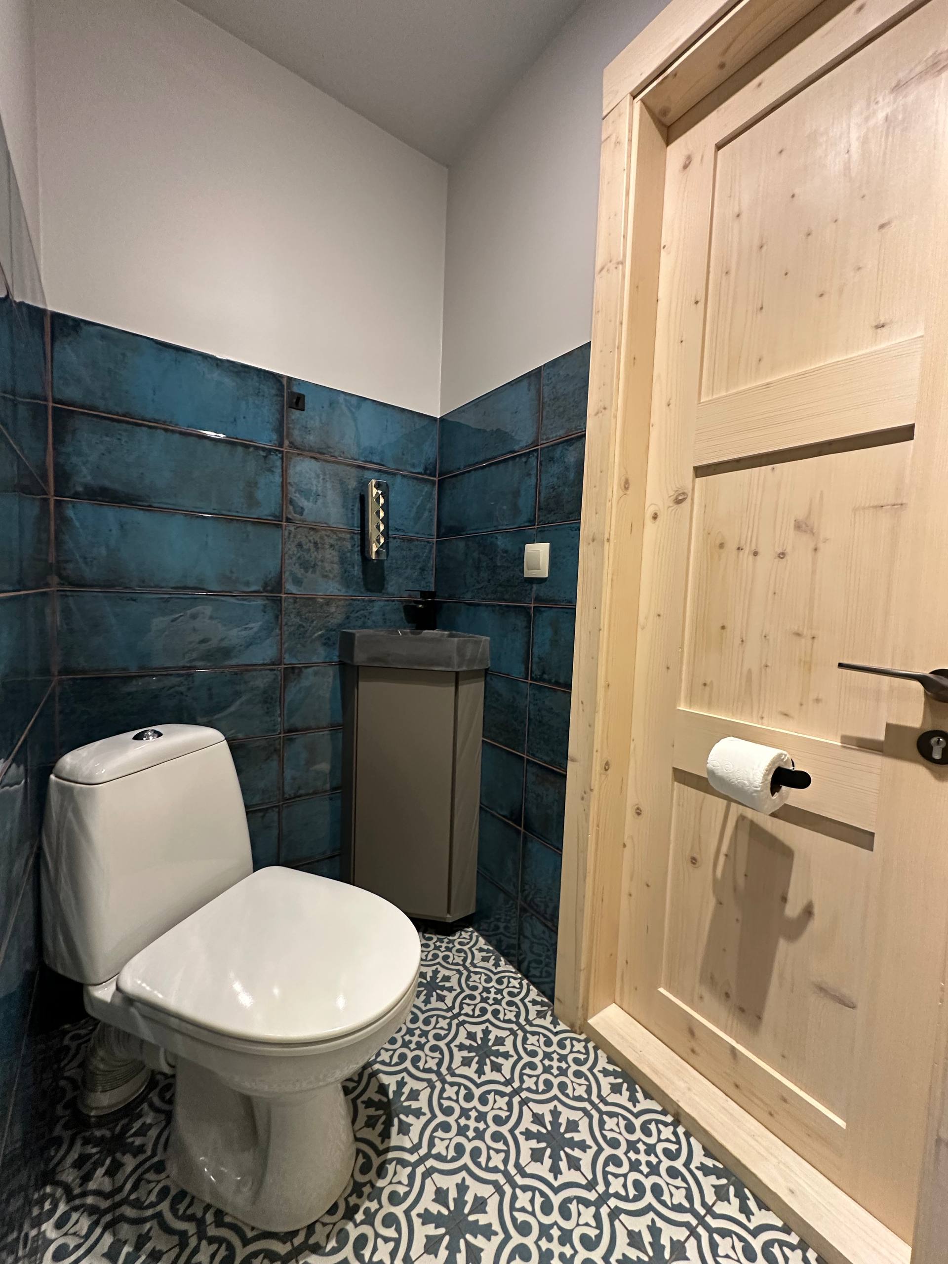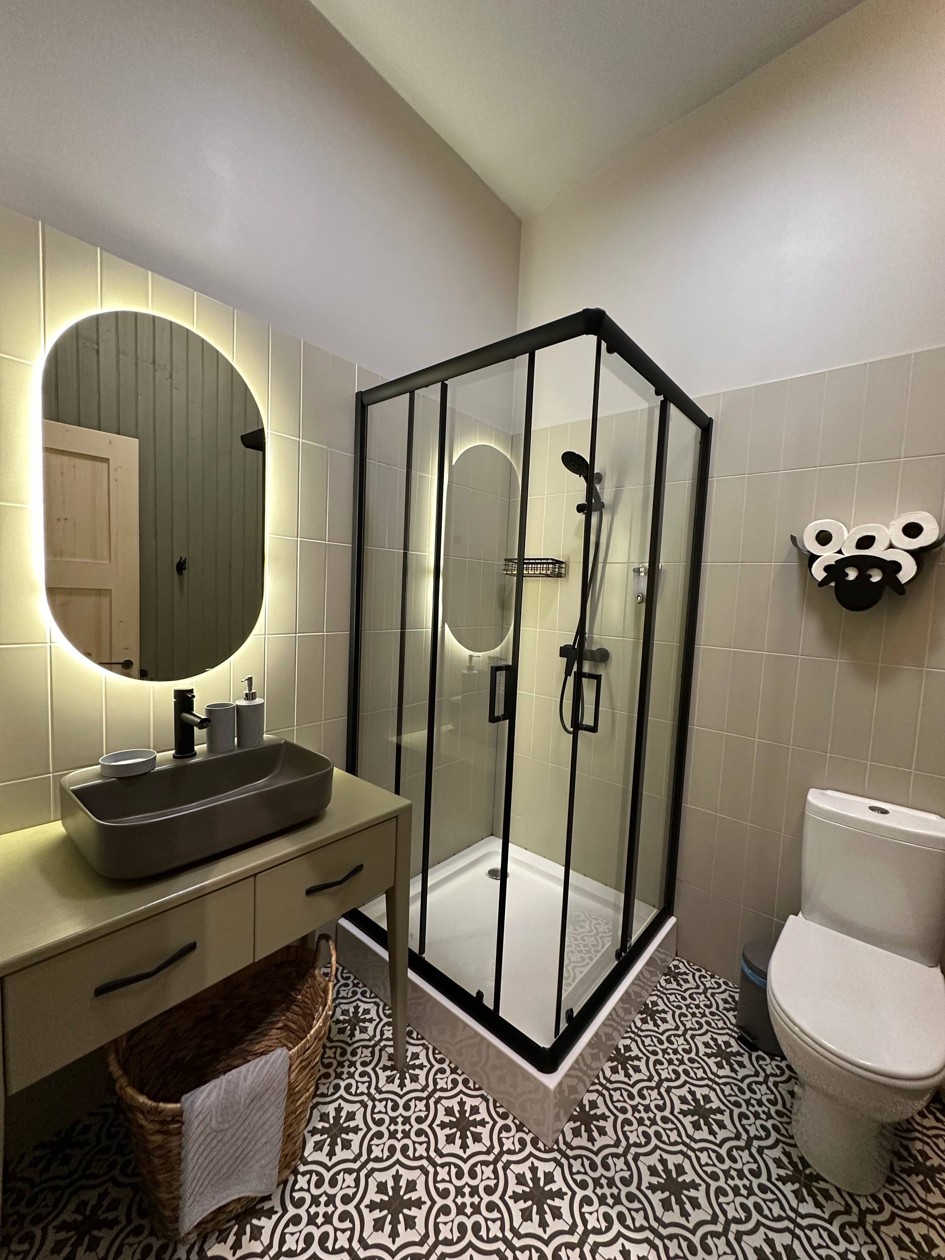 В Аркарі ми подбали про 2 санвузли. В одному з них розміщений туалет, рукомийник та пральна машина. В іншому також є туалет, велике дзеркало та умивальник. А найголовніше, тут ви зможете потішити себе теплим тропічним душем. Температура у ванних кімнатах вище 22 градсів, щоб приймати душ було одне задоволення. Після ванних процедур, ви розумієте різницю між зничайним будинком та будинком з каміном в Карпатах. Адже після душу, ви прямуєте до вітальні грітися окутавшись в тепле покривало.