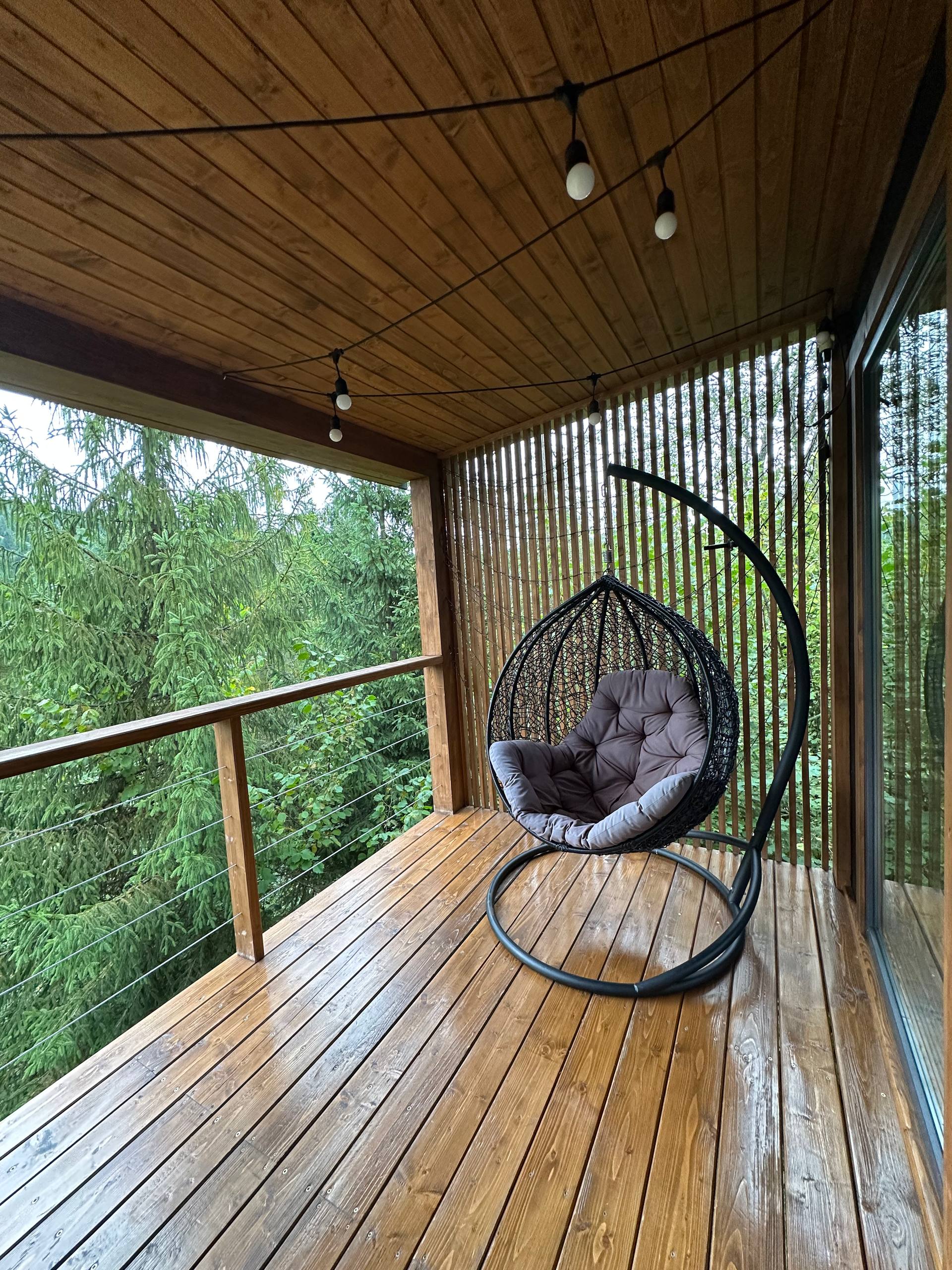 Ця тераса унікальна тим, що знаходиться на висоті 4 метрів, і вийшовши на неї, ви буквально опиняєтесь серед верхівок дерев. Тут розміщена затишна лаунж зона, де можна випити кавусі та потеревенити з друзями. Або ж просто насолодитись звуками лісу, вмостившись в гойдалку-кокон. Здалеку влісі можна почути співи дрозда чи стукіт дятла по корі дерева. Хто зна, може цього разу ви зустрінете оляпку, яка живе тільки в Карпатах.